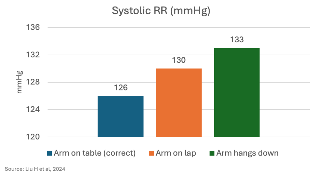 Eine im Oktober 2024 veröffentlichte randomisierte Studie testete drei verschiedene Armhaltungen mit 133 Teilnehmern (Durchschnittsalter 57). Die Blutdruckmesswerte zeigten signifikante Unterschiede. Eine falsche Armhaltung kann also zu Fehldiagnosen und Überversorgung führen: