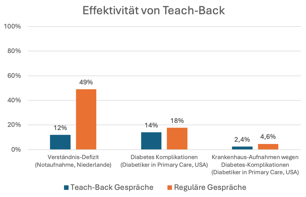 Die Datenlage ist klar. Ein Systematic Review im PLOS ONE (2020) zeigte in 19 von 20 Studien positive Ergebnisse. Ein neuer Review im Juni 2025 bestätigte diese Befunde. Die Methode verbesserte das Verständnis, die Erinnerung und manche klinischen Endpunkte – etwa Adhärenz, HbA1c-Werte und Krankenhaus-Wiederaufnahmen. Sie könnte sogar Schadenersatzklagen reduzieren.