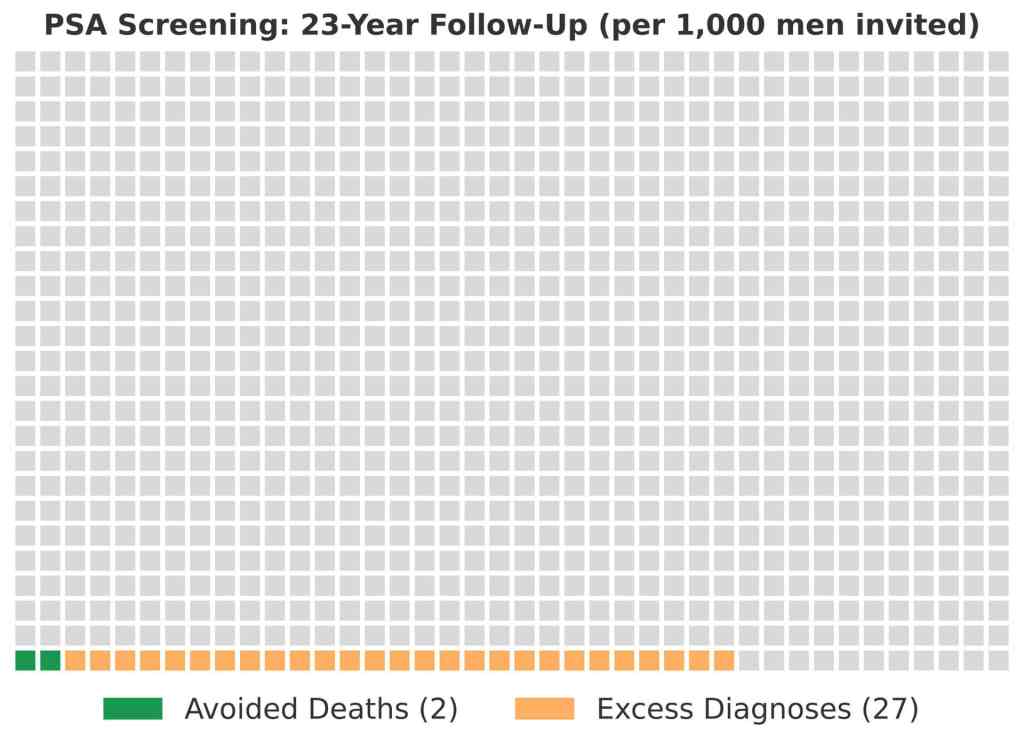 This graph shows that for ever 1,000 men invited to PSA screening, two deaths were avoided, and 27 other men were overdiagnosed with prostate cancer. In the same time period, half of all men died from other causes.